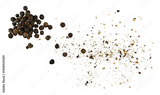 Pile of black pepper seeds and ground isolated on a transparent background. Completely in focus. Full depth of field. PNG.