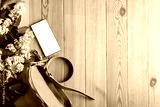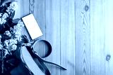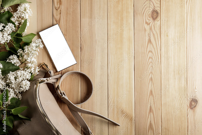 Mother's Day greeting card scene with Lilac Flowers, smartphone and elegant handbag. Flat lay composition with copy space for text or product placement.