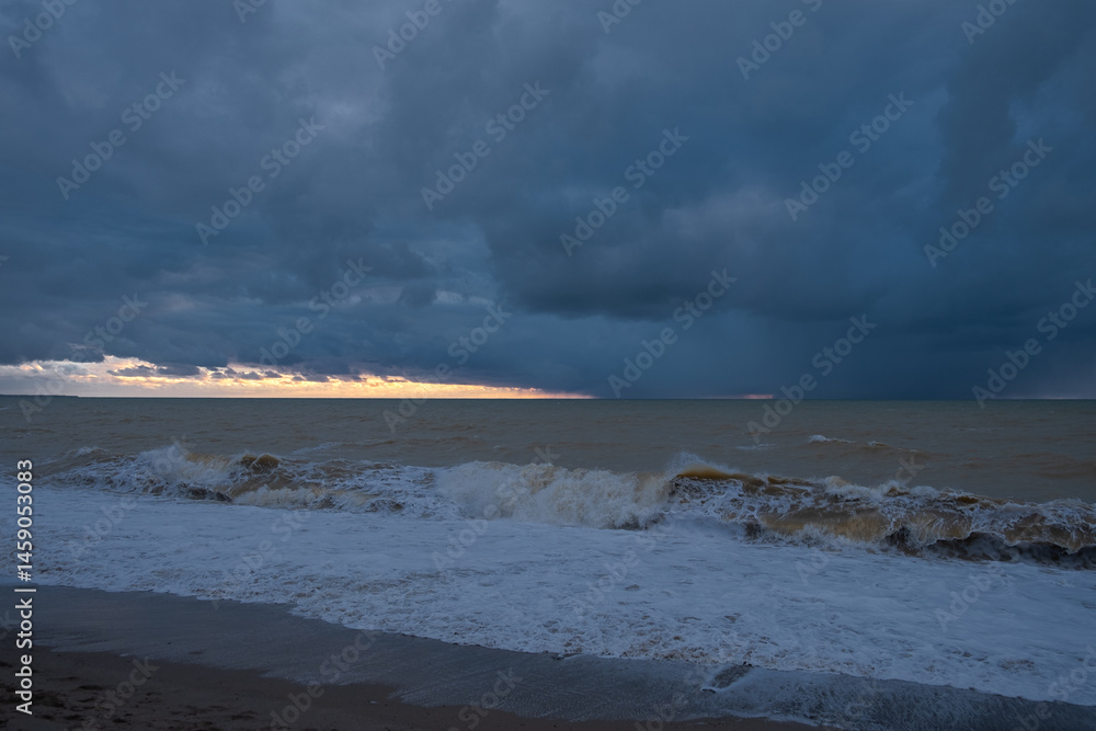 Storm sea sand beach is a neutral color. Natural background in beige shades. The raging elements, the majestic view of the sea surf. Foaming waves roll on the shore. The concept of disaster, threat.