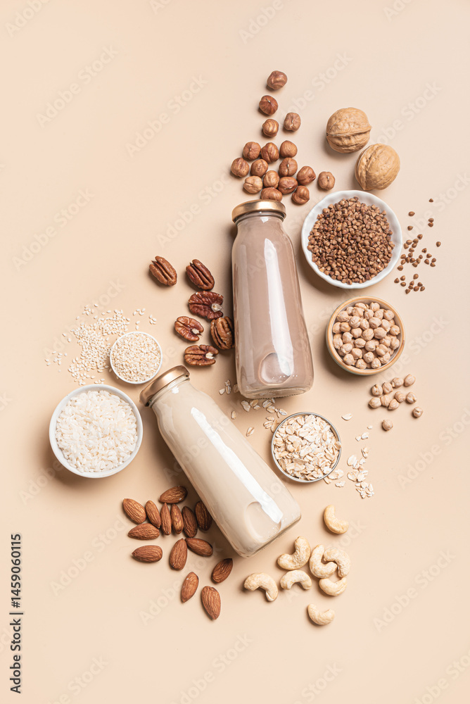 Vegan plant based milk bottles and ingredients. Non dairy drink.