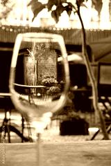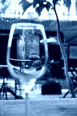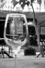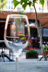 Bright flowers surround a glass, showcasing a peaceful atmosphere in the outdoor dining area