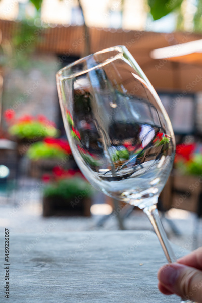A delicate glass tilts, reflecting colorful blooms in a vibrant outdoor setting