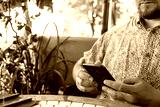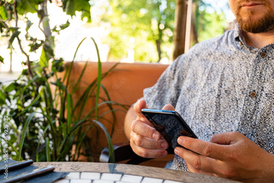 A man sits at a wooden table in greenery, using his smartphone in the sun