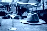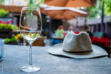 Sparkling white wine shines in the sun beside a stylish hat, suggesting leisure and enjoyment