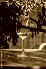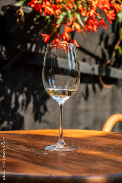 A delicate wine glass rests on a warm wooden table surrounded by lush greenery and colorful flowers