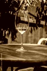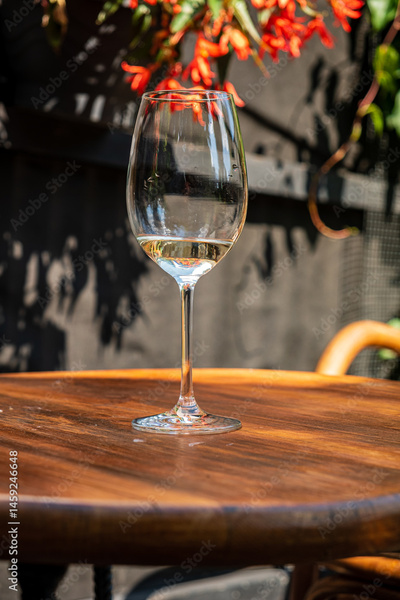 A clear wine glass with white wine rests on a wooden table, with colorful flowers behind it