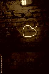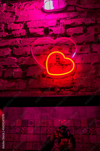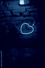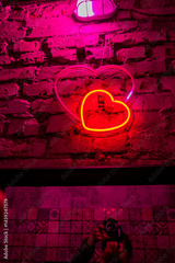 A glowing neon heart stands out on textured brick, creating a cozy atmosphere