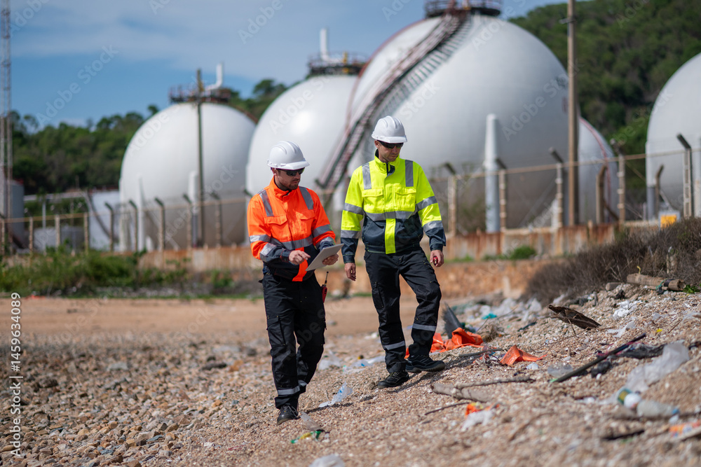 Environmental engineer or workers examining waste water along a large industrial waste water or pollution monitoring and maintenance to ensure systems operate effective environmental regulations.