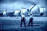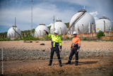 Environmental engineer or workers examining waste water along a large industrial waste water or pollution monitoring and maintenance to ensure systems operate effective environmental regulations.
