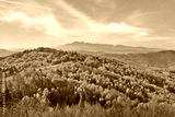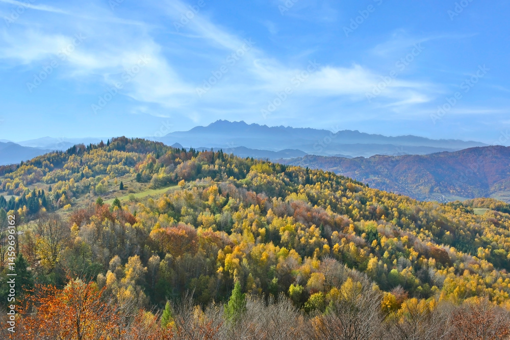 Autumn view from the tower at Koziarz peak in Beskid Sadecki Mountains, Poland.