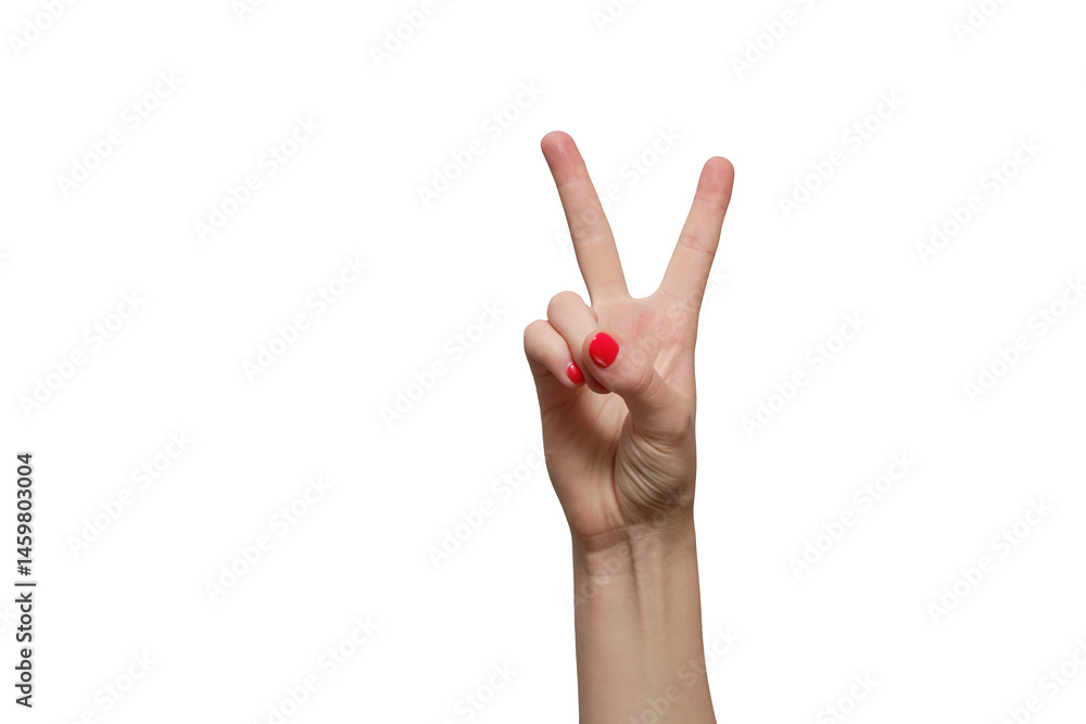 Woman’s hand with red nail polish showing a peace or victory sign, isolated on a transparent background. Perfect for icons, banners, or communication themes.
