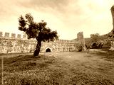 Ancient Castle Walls Surrounded by Green Grass and Large Tree..