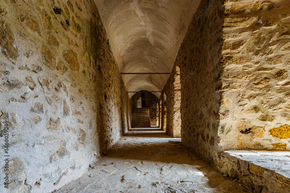 Historic Stone Corridor with Arched Windows and Atmospheric Lighting..