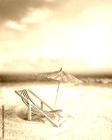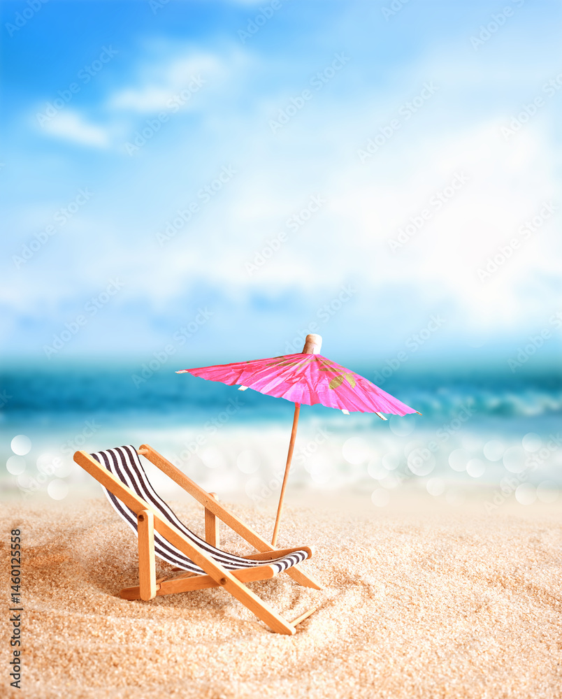 Beach chairs on the gold sand beach with umbrella, cloudy blue sky and sun
