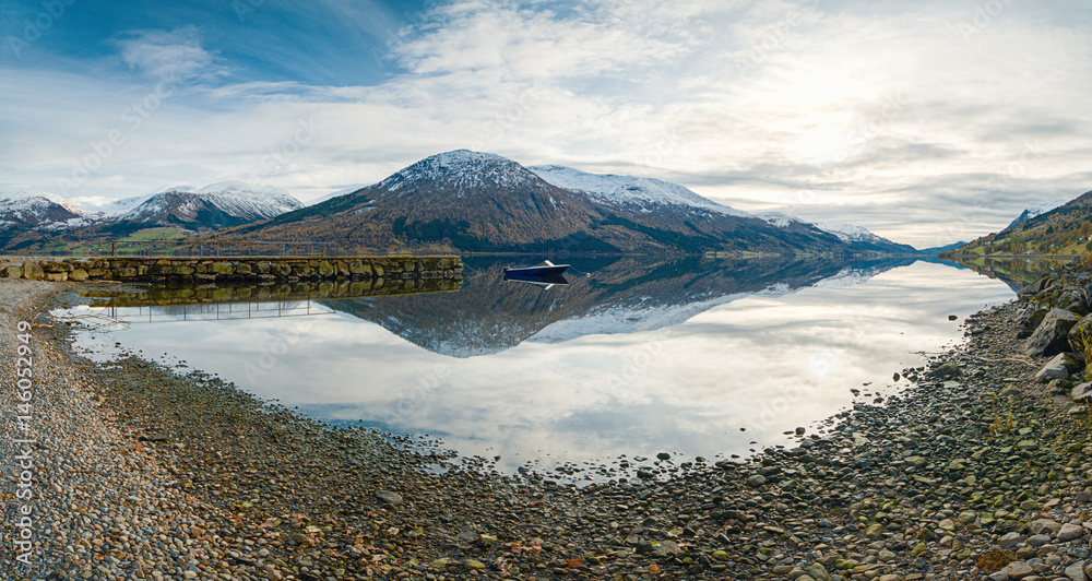 Norwegian autumn landscape – fjord with reflection of mountains in clear water and boat at pier.