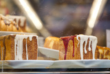 Delicious desserts in a bakery showcase during a sunny afternoon
