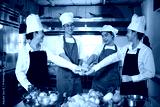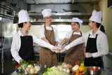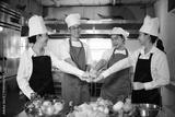 Group of cooking school students joining hands in teamwork gesture before beginning culinary tasks