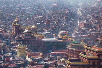 Top view monastery at Larung gar (Buddhist Academy) in a warm and foggy morning time, Sichuan, China