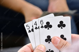 Closeup view of paper card outdoor playing, 4,5,6 club cards, soft and selective focus, new edited, concept for recreational and relaxing activity with friends in freetimes and vacation concep