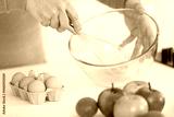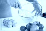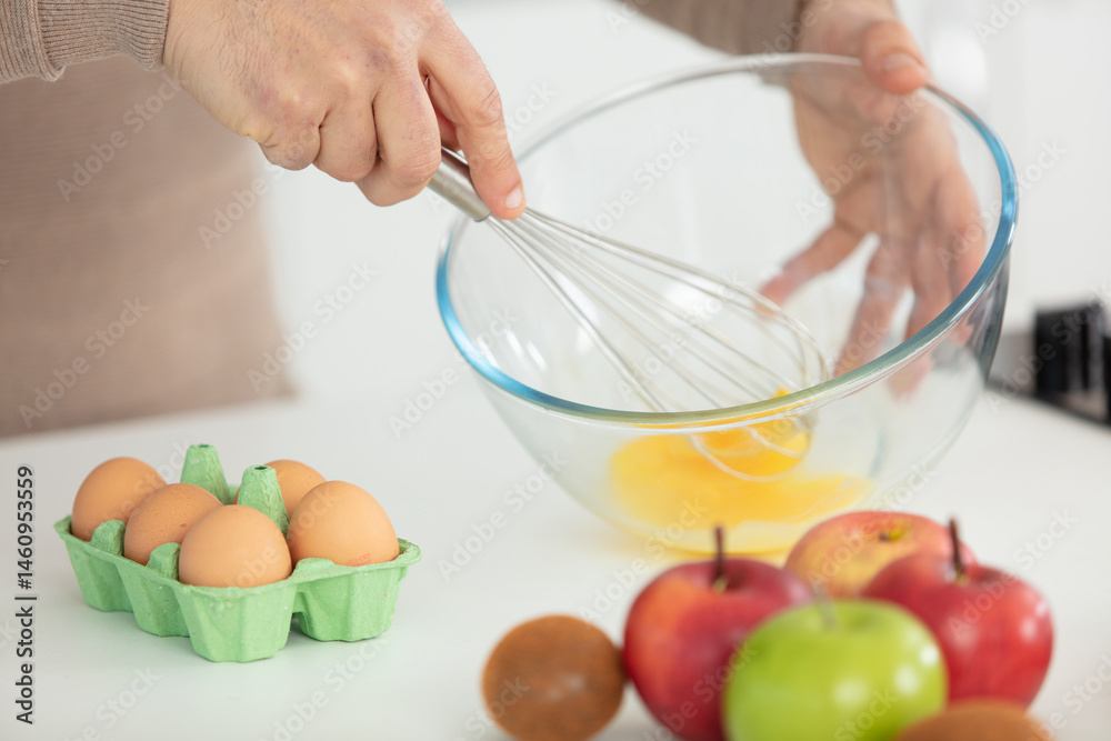 female chef beating eggs with wire whisk in bowl