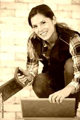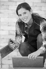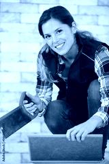 pretty young woman using a hand saw to cut