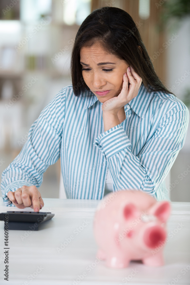 frustrated woman with calculator and piggybank