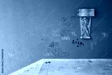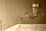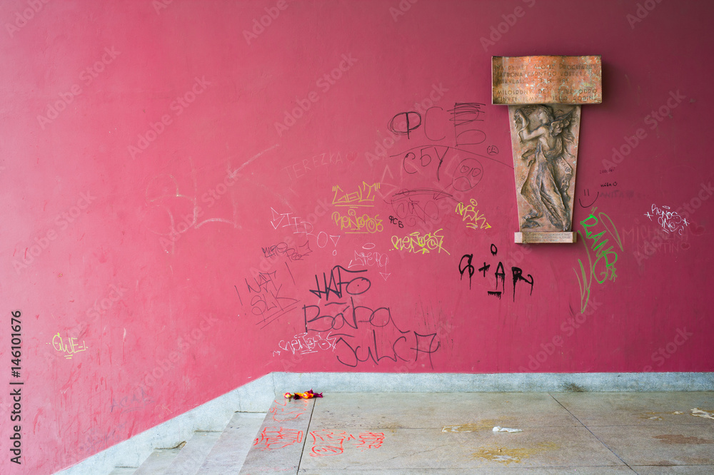 Defacement and vandalism on public space - wall is defaced and painted by spray. Mess and clutter on the ground. Historical relief on the side