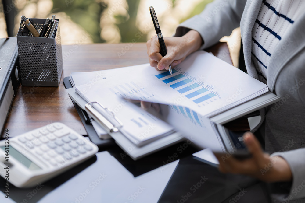 Woman Analysis Business Accounting working with Individual income tax return Accounting concept