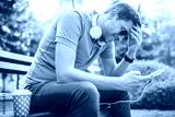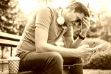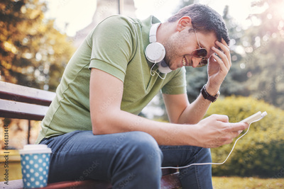 Listening to music with mobile phone and headphones. Lifestyle concept