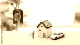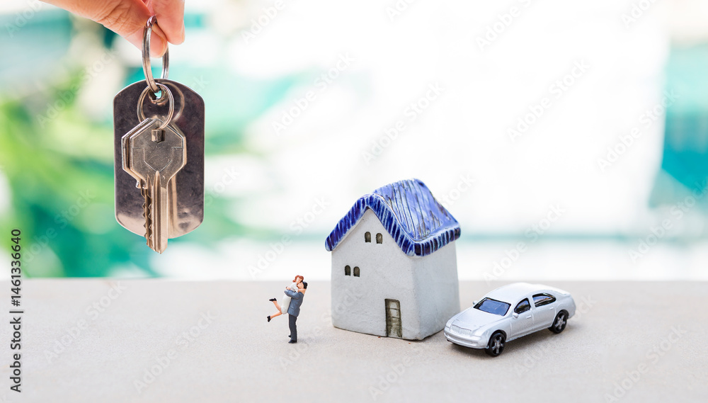 House key in girl hand with happy couple and house model with model car over blurred swimming pool background, success business, property and real estate business