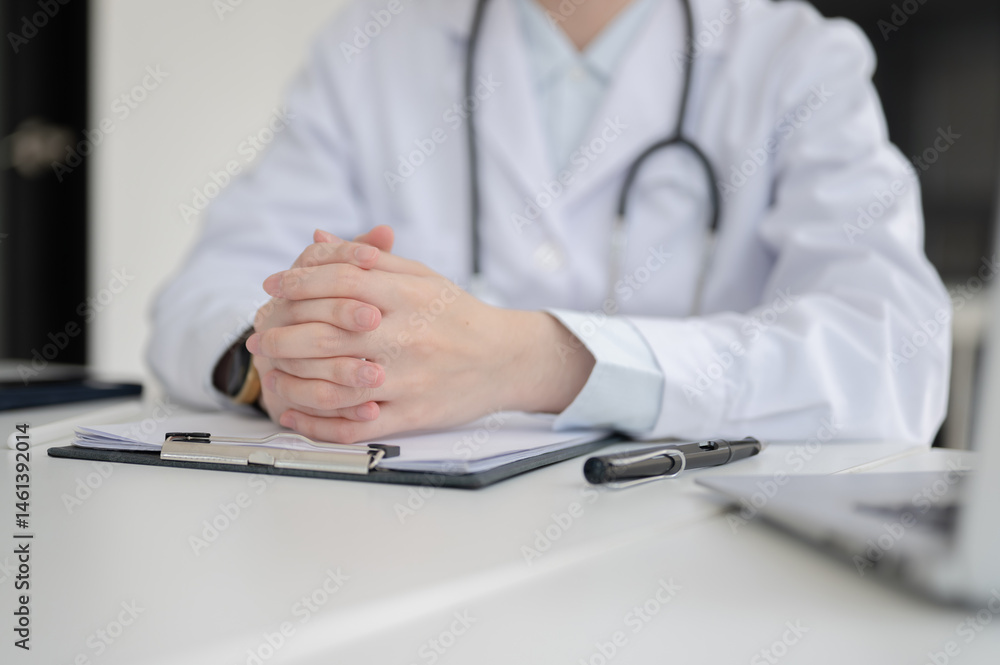 Close up of a doctor with stethoscope clasping hands on clipboard at white table in diagnosis room