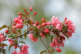Apple tree branch with pink flowers in full bloom, against blurred sky background.