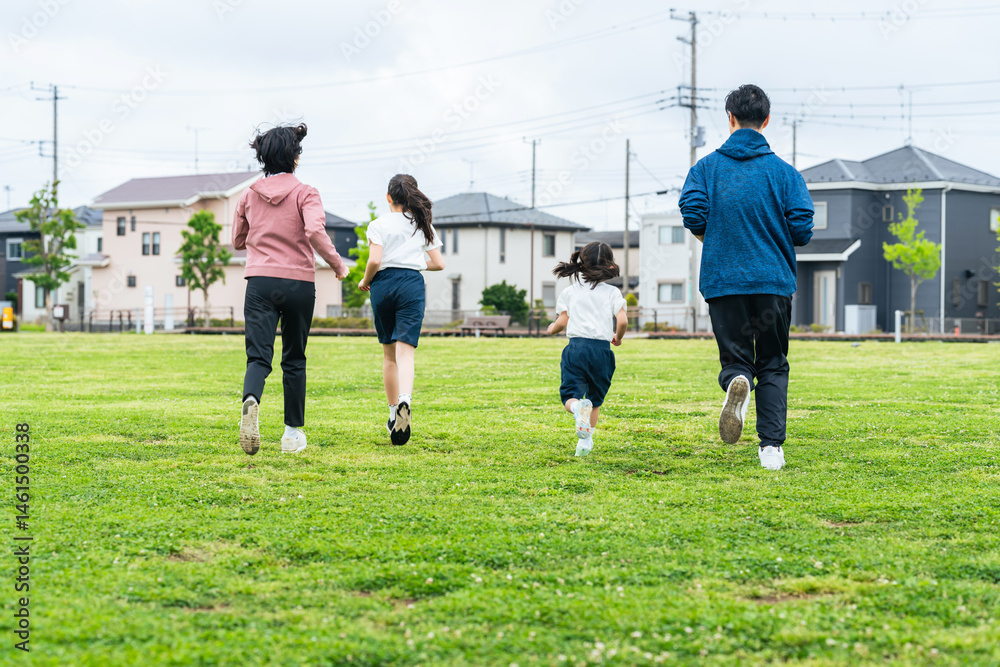 芝生の公園を走る家族の後ろ姿