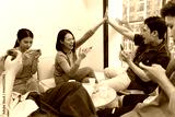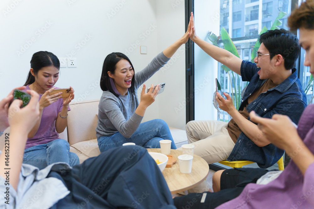 Friends enjoying a lively game night at home while using smartphones for entertainment and connection