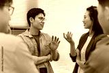 Group of young adults having a conversation in an office setting during a meeting in the afternoon