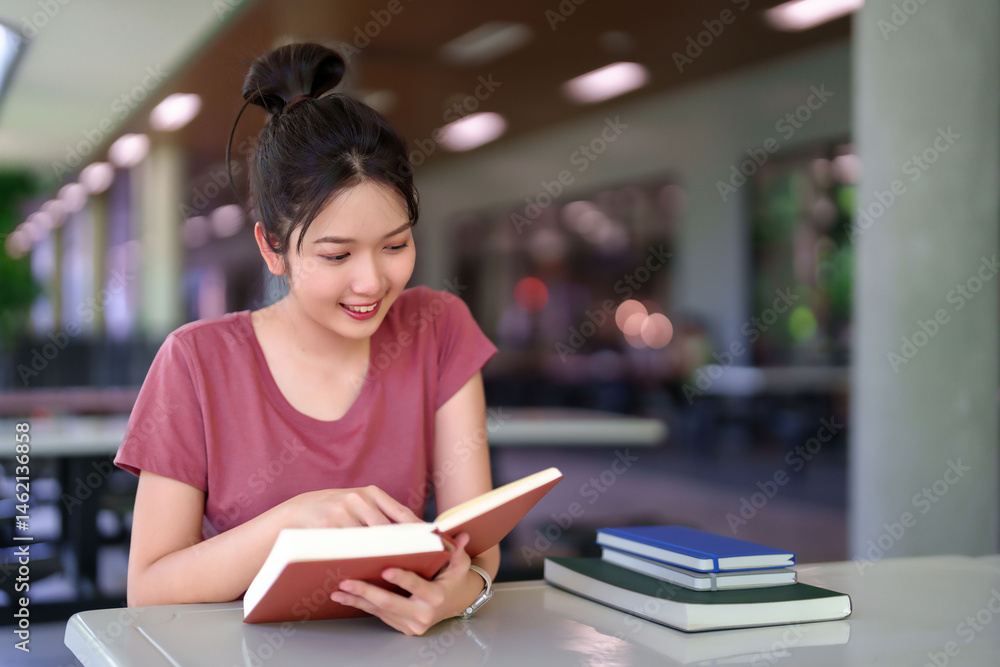Young Asian Woman Reading Book at Library Table Learning Studying for Exam Education with Focus on Knowledge Success and Bright Future