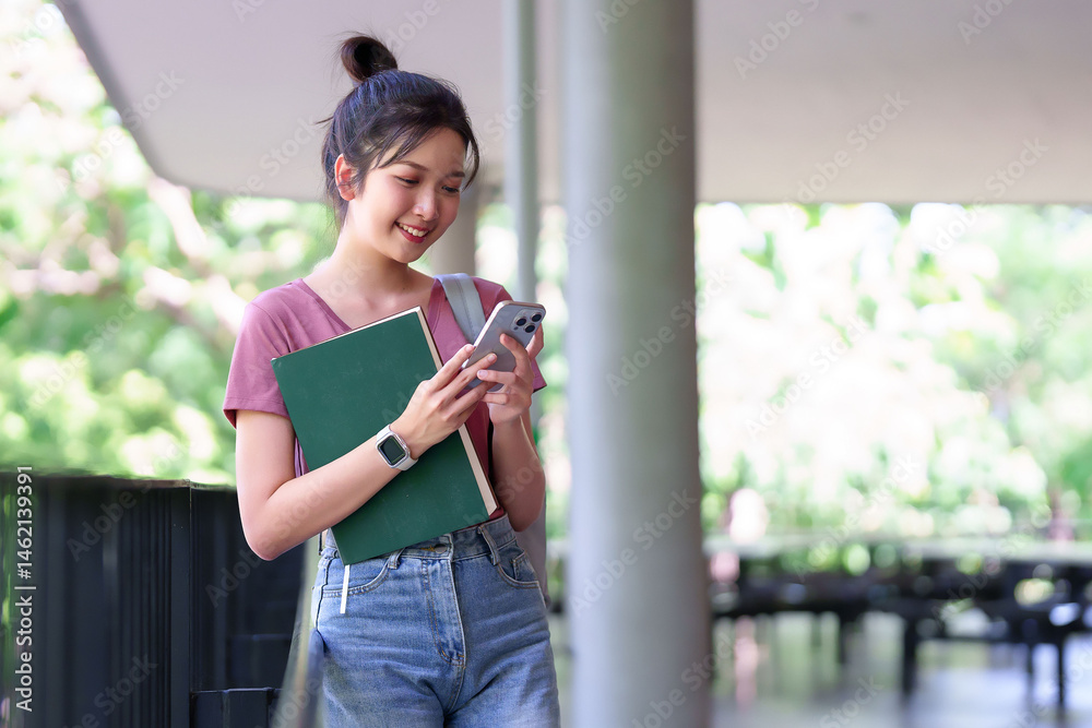 Asian Young Woman Student Using Mobile Phone with Books at University Campus Smiling Education Technology Learning Study College Life