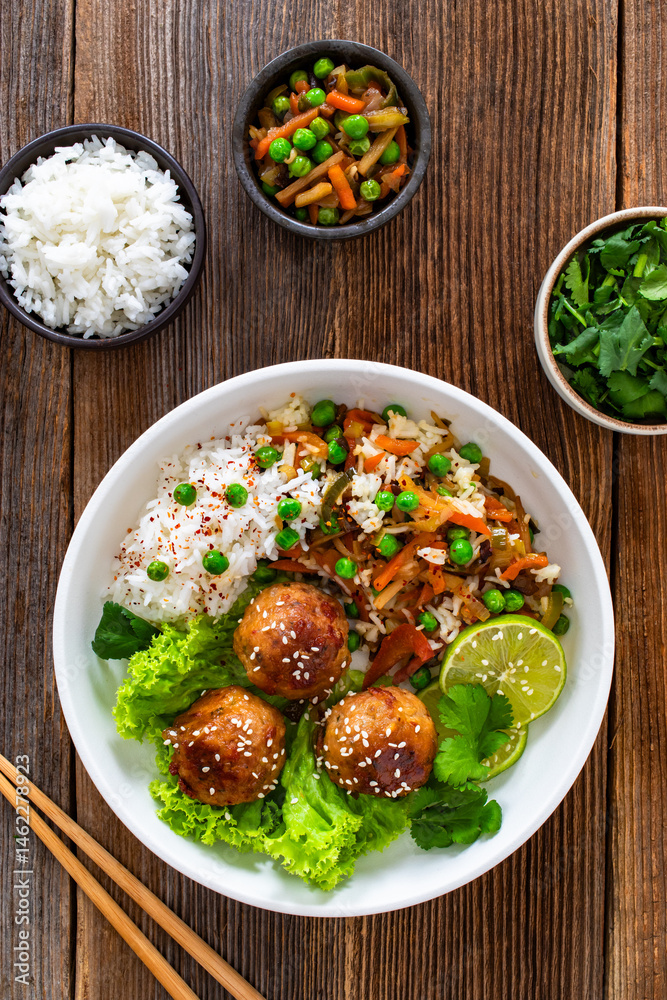 Asian style fried meatballs with mixed vegetables served with white rice on wooden background