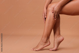 Epilation. Woman showing her legs with smooth soft skin on beige background, closeup. Space for text