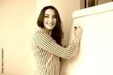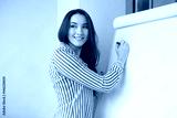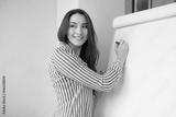 Smiling girl standing with a marker near a whiteboard and drawing. Business, startup, planning, manager woman start writing on a flipchart