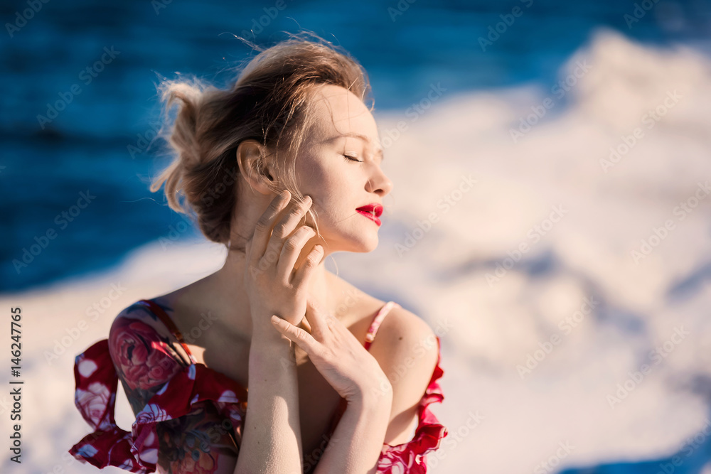 Girl slender beautiful blonde in a red summer dress in the frost on a background of blue mountains svalbard on the Spitsbergen city Longyearbyen , in sunny weather posing as a model