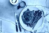 Beef grill steak with green asparagus on a plate. Healthy dinner or lunch, top view. High quality photo