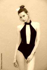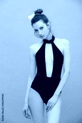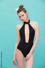 Young fresh and sensual girl with a flower in her hair wearing black swimsuit and posing over color background. Skinny model in body lingerie. Summer swimwear fashion campaign