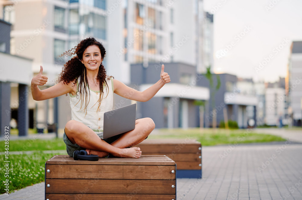 young woman with laptop sits outdoors on urban bench, giving thumbs up, looking confident and happy. remote work, freelance lifestyle concept in modern city environment