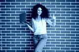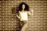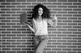 confident woman with laptop gives thumbs-up in front of brick wall. casual attire reflects relaxed workplace or study environment. promotes productivity and positive attitude.