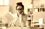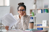 Tired female office worker looking at camera and holding documents, sitting at desk in office. Unhappy woman feeling stressed because of lot of paperwork