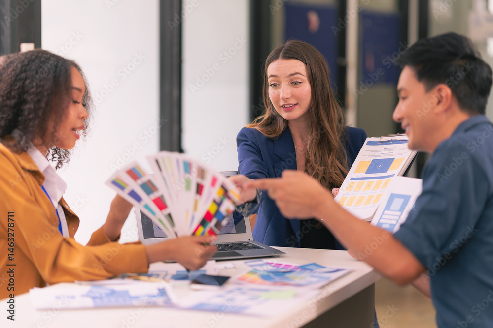 Group of business people designing product that represents the result of successful teamwork with graphic design working with tablet on desk in office.