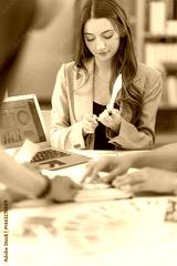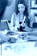 Group of business people designing product that represents the result of successful teamwork with graphic design working with tablet on desk in office.