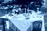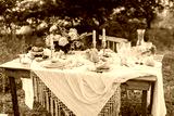 picnic, summer, holiday concept - beautiful decorated table at green lawn with trees, openwork white tablecloth, glassware, colorful bouquet of peony flowers and roses, fruits, candlesticks, lemonade