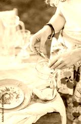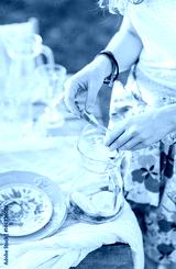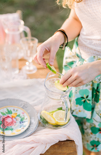 picnic, people, food, summer, holiday concept - cocktail lemonade non-alcoholic, hands of young woman mix slices of lemon, lime and mint leaves in a glass flagon, table with festive dishes, glasses.